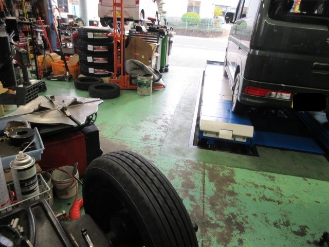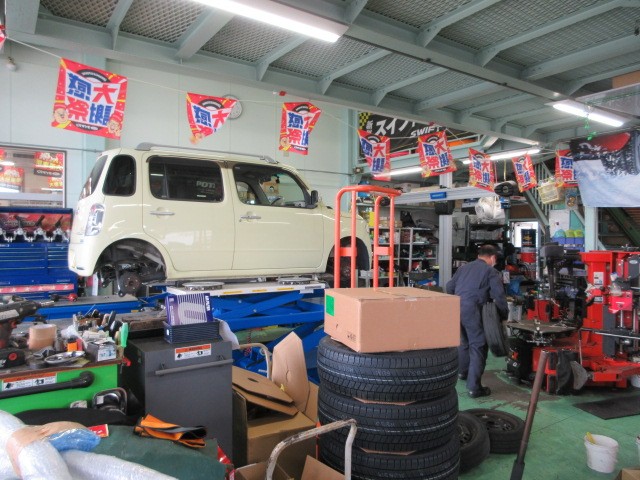 こちらのココアもスタッドレスタイヤを装着です。工場がゴミゴミしていますね。