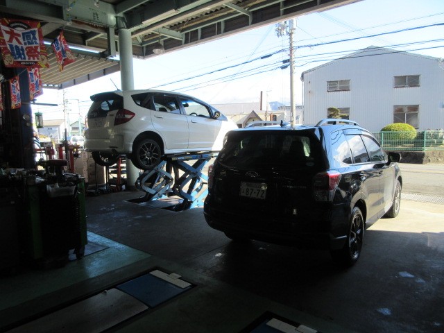 フォレスターにもスタッドレスタイヤ装着 隣のフィットRSさんは夏タイヤ交換にスタッドレスタイヤをお持ち帰りです。たくさんのお買い上げありがとうございます。