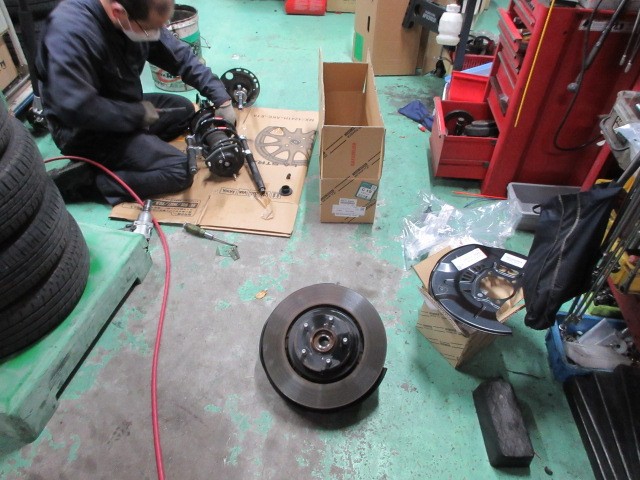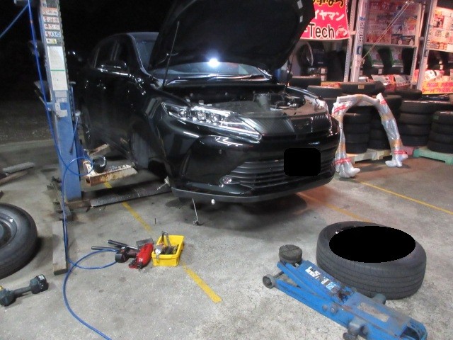 業者様からの依頼で、ハリアーのサスペンション交換です。暗くなって時からの作業なのに・・・