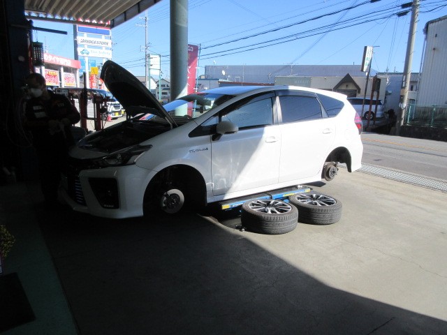 遠方から持って来てくれたプリウスアルファの車検整備です。