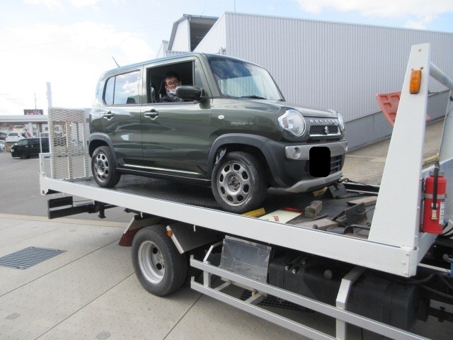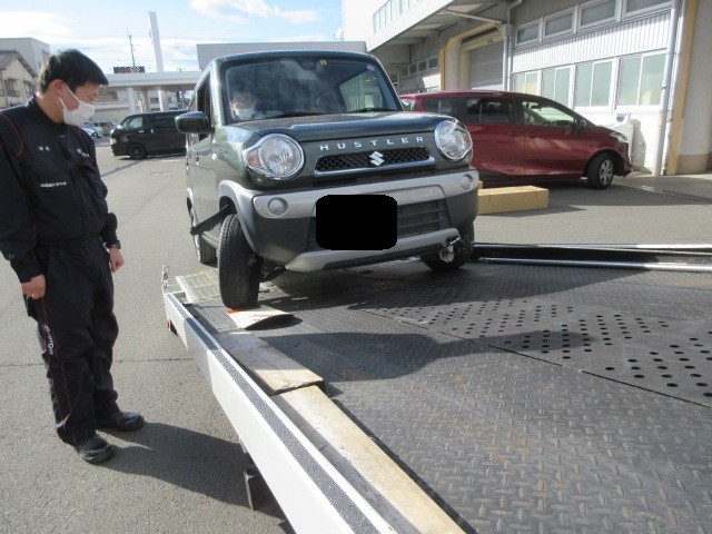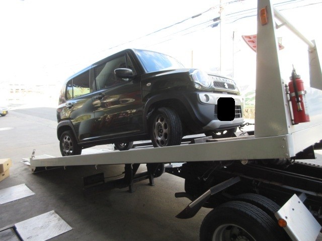 業者様からの依頼で、ハスラーの修理引き取り・・・事前に状況を聞くと「動かせますが、アライメント狂ってるから自走は無理ですよ・・・」との事