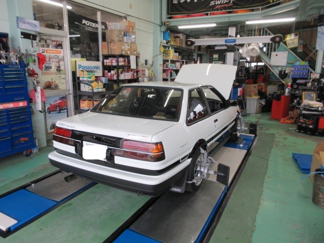 お取引先の社長様のAE86改やっとレストア?から帰って来たのでアライメント調整・・・