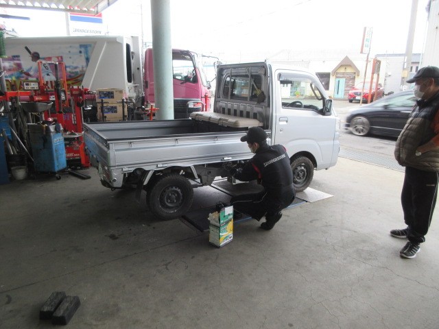 ハイゼットトラックのバッテリー交換です。後ろから怖い人が作業を監視しています。ドキドキ