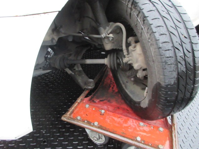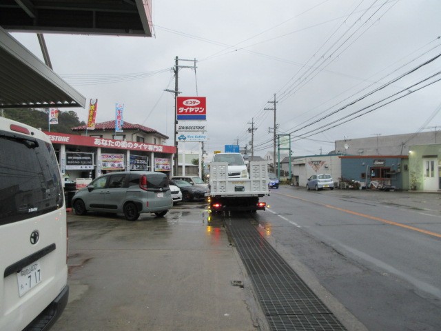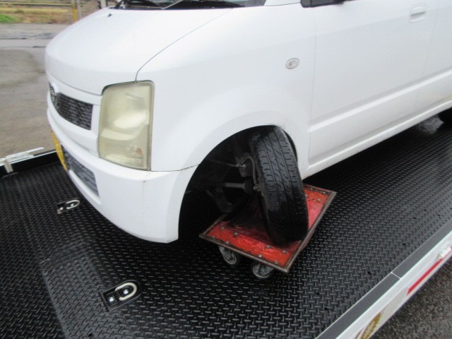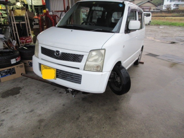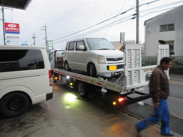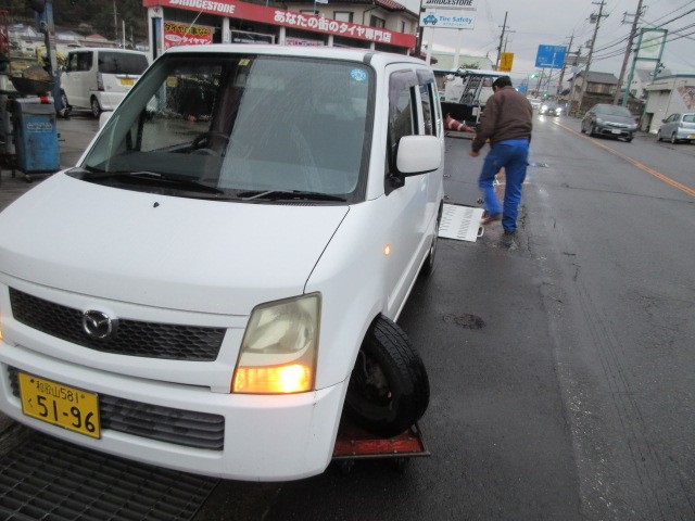 雨の中 ワゴンRが運ばれてきました・・・パンク?
