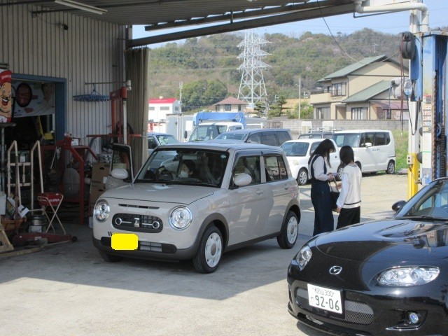 朝一にラパンの納車式です。普通のラパンよりカワイイですね。