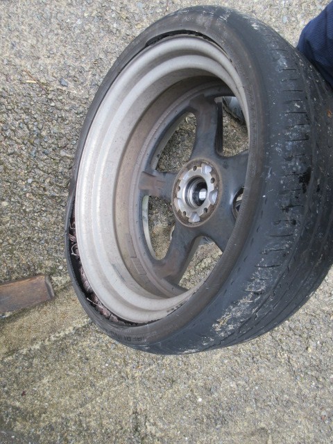 タイヤはバースト状態ですね。高速道路でなくて幸いでしたね。