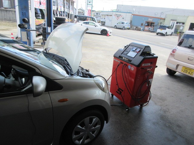 代車のミラが売れたので納車手入れエアコンマシーンで、エアコンのチェックとガスのクリーニング 当店でお買い上げのお車はエアコンマシーンで施工した後お客様の元へ