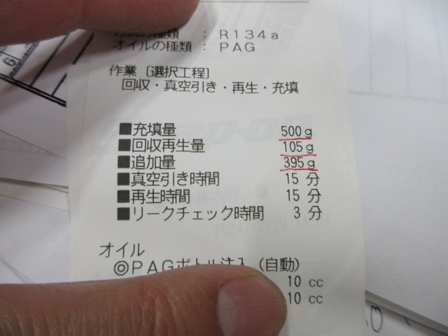 エアコンガスが500g必要な所105gしか入っていないと測定結果です。