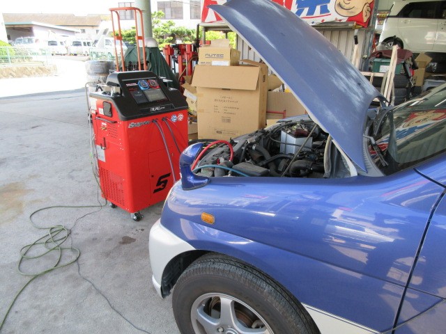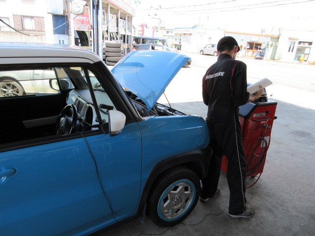 車検整備とFガラス交換で預かっているハスラー君をエアコンガスクリーニング致します。