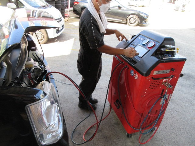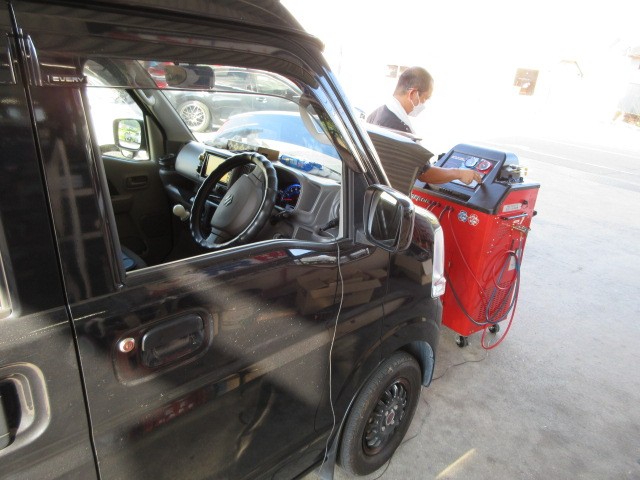 ボクのマシンのエブリィバンくんのエアコンの効きが甘いので社長に頼んでエアコンガスクリーニングさせて貰いました。