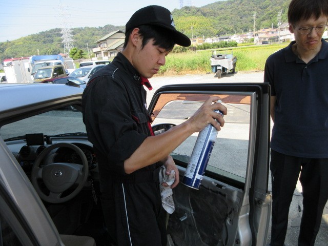 ピノの運転席側のガラスが動かなくなったので点検していますモーターが悪いみたいですね。