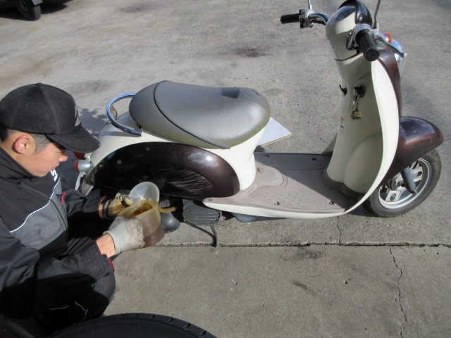 真剣な顔でスクーターのオイル交換ですね・・・