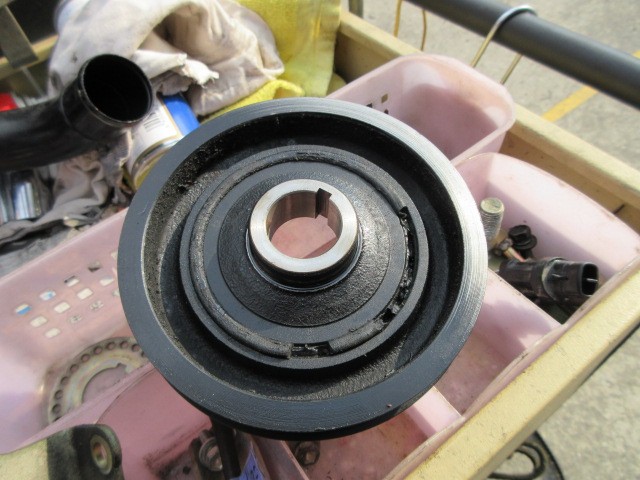 クランクプーリーのダンパーが傷んで来ましたね。部品調べたら18,900円もするので諦めました。