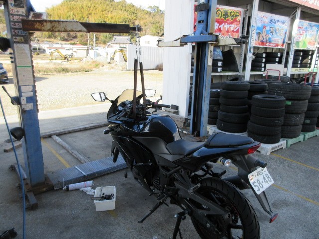 専用のバイクスタンドを使いますが、念のために吊っときます。