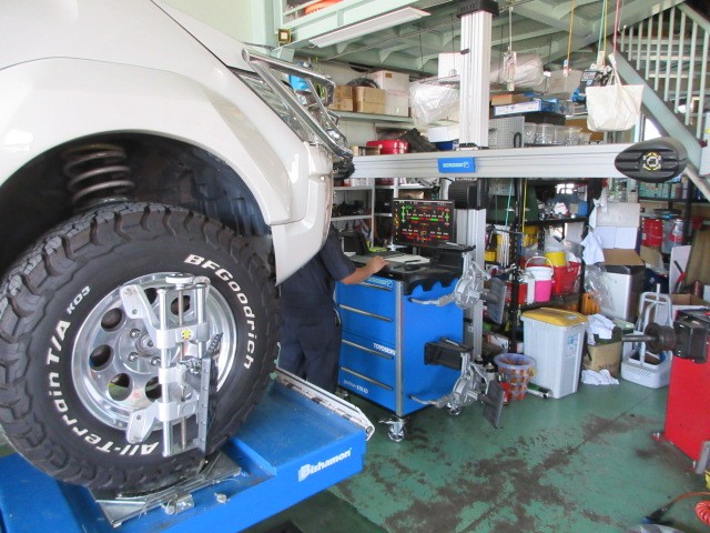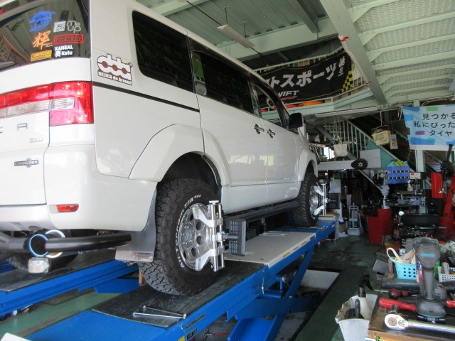凄く車高の上がったデリカさんにアライメント調整頼まれました。何でもタイヤノイズが大きいそうなので、どうにかならんか?との事です。・・・