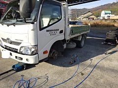 トラックの車検です。整備工場に持って行く前に、タイヤ交換と、ダンプなので下廻り洗っていきます。
