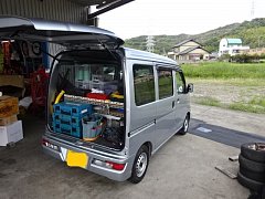 お仕事用のハイゼットバンに室内のキャリアとルーフキャリアの取り付け作業です。
