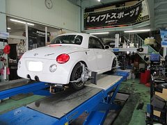 先日 クスコの車高調を組んだZC33Sスイフトスポーツ慣らしが終わって車高も決まったのでアライメント調整致します。