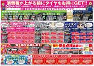 増税前の今がお買得!クーポンでさらにお買得♪ 2013年2月22日 キャンペーン期間2013年2月22日(土)~28日(金)お得なクーポン付チラシ配布を22日朝刊折込広告または店頭にてします。是非、御利用下さい♪また、タイヤ4本ご購入の方にダイソンクリーナーなど豪華賞品が当たるチャンス!!ふるってご応募ください♪期間:2013年2月15日~3月31日