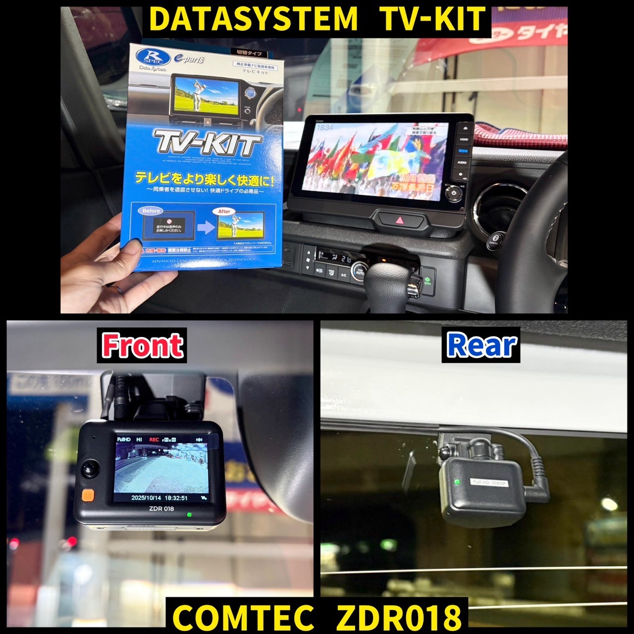 こちらも新車のNボックスに、データシステムさんの【TVキット(TVキャンセラー)】とコムテックさんの【ZDR018】前後録画ドライブレコーダーを取り付けさせていただきました!(^_-)-☆