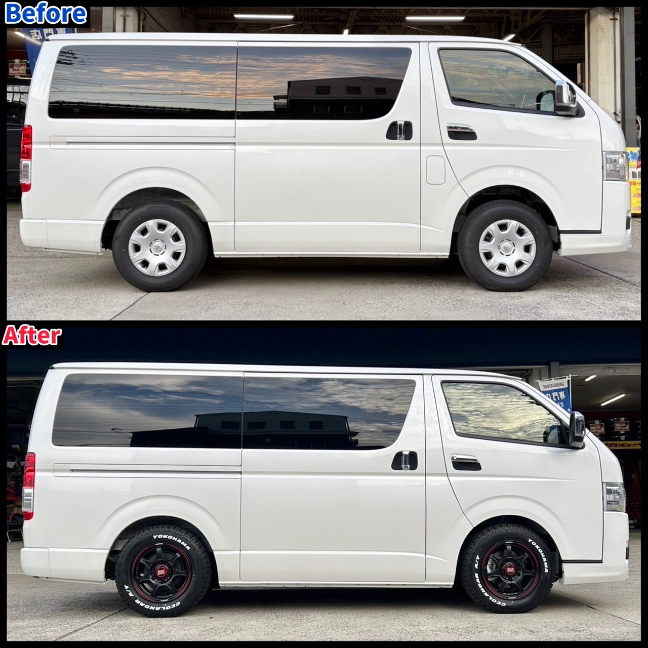 さて今回は、以前U様の200系ハイエースにローダウンキットとアルミホイールを取り付けたのでご紹介します。