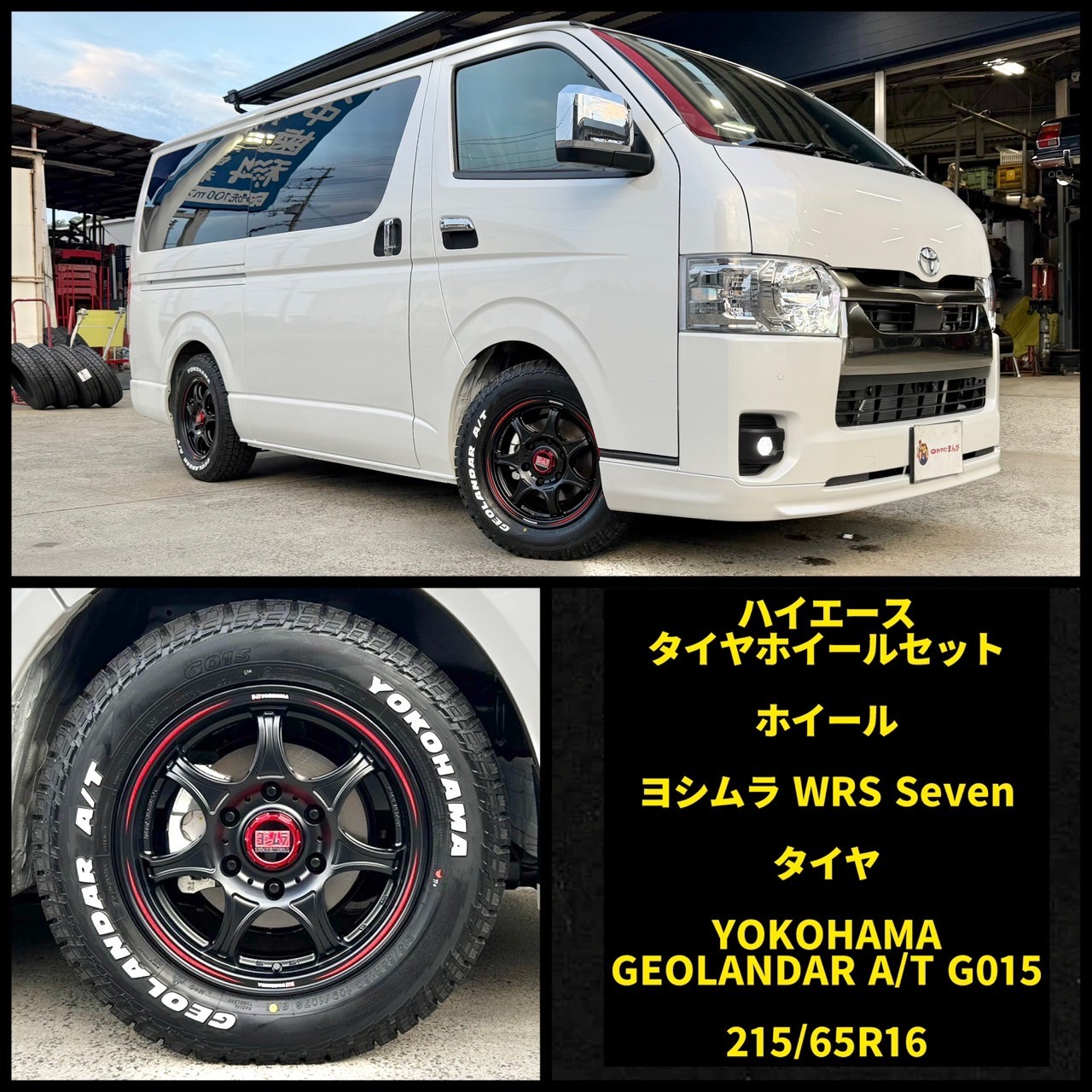 アルミホイールは、ウェッズさんとヨシムラさんがコラボしたアルミホイールの【WRS セブン】16インチアルミホイールとタイヤは、ヨコハマタイヤさんの【ジオランダーA/T G015 】ホワイトレタータイヤをセッティング。