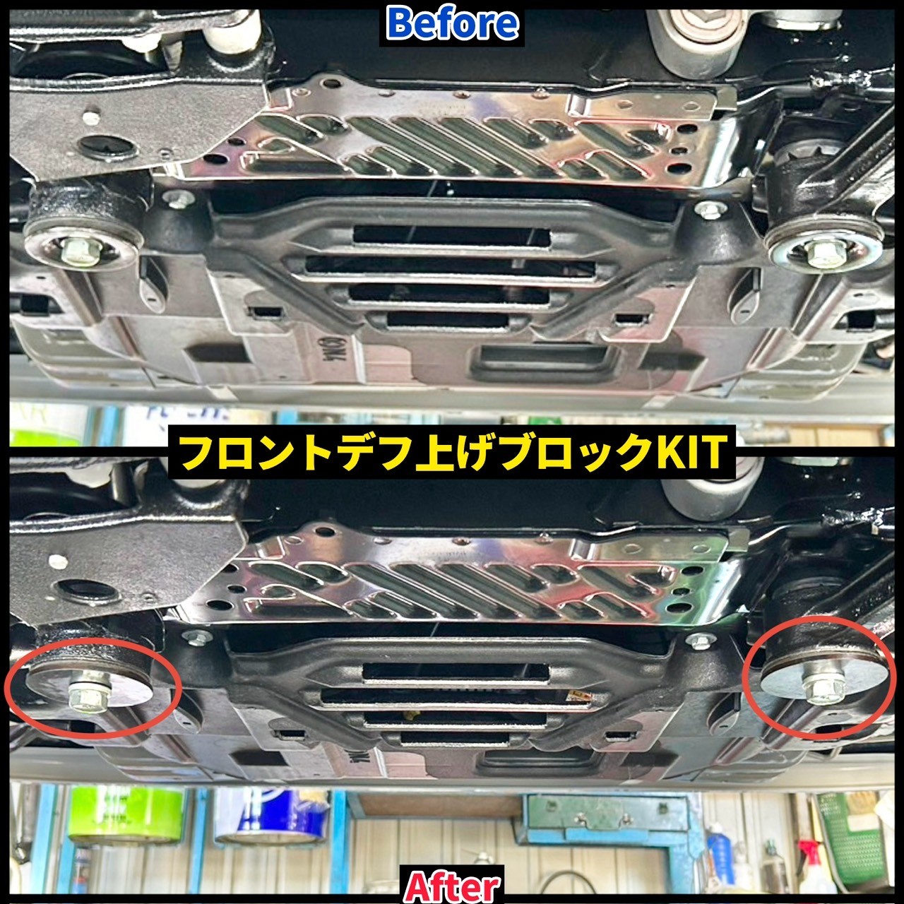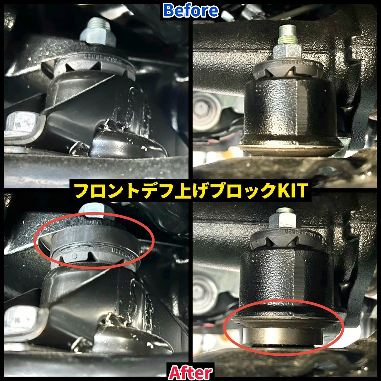 ↓ 後日対応で、車体が少し振動(ジャダー)するとのことでしたので(4WD車特有のローダウン後に発生する現象)、ピットブルさんの【フロントデフ上げブロックキット】を取り付けさせていただきました!