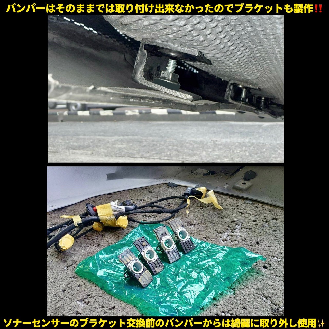 取り付け用のブラケットも製作。一部加工も実施し、クリアランスソナーは、元のバンパーから外して綺麗に移設させていただきました!(*^^)v