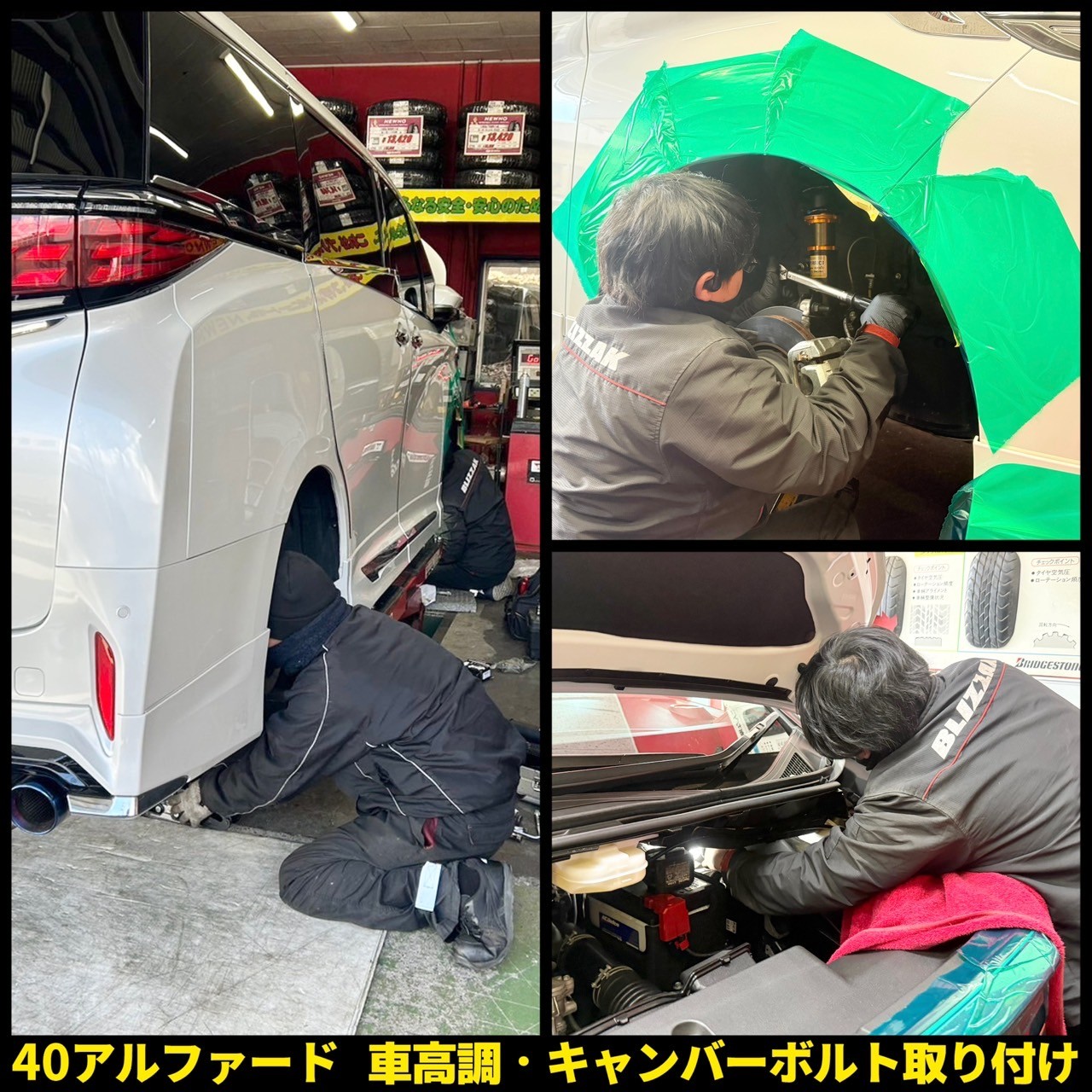 さて今回は、40系アルファードのお客様より、持ち込みの車高調とキャンバボルトの取り付け依頼を頂きましたのでご紹介します。