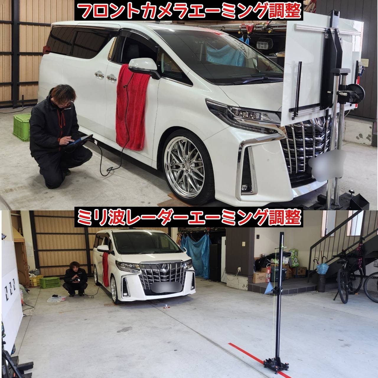 近年のお車に標準装備の安全装置(自動ブレーキ・車線逸脱警報・追従クルーズ機能など)を正しく作動させるため調整(基準位置に正確に合わす作業)が必要となっております。