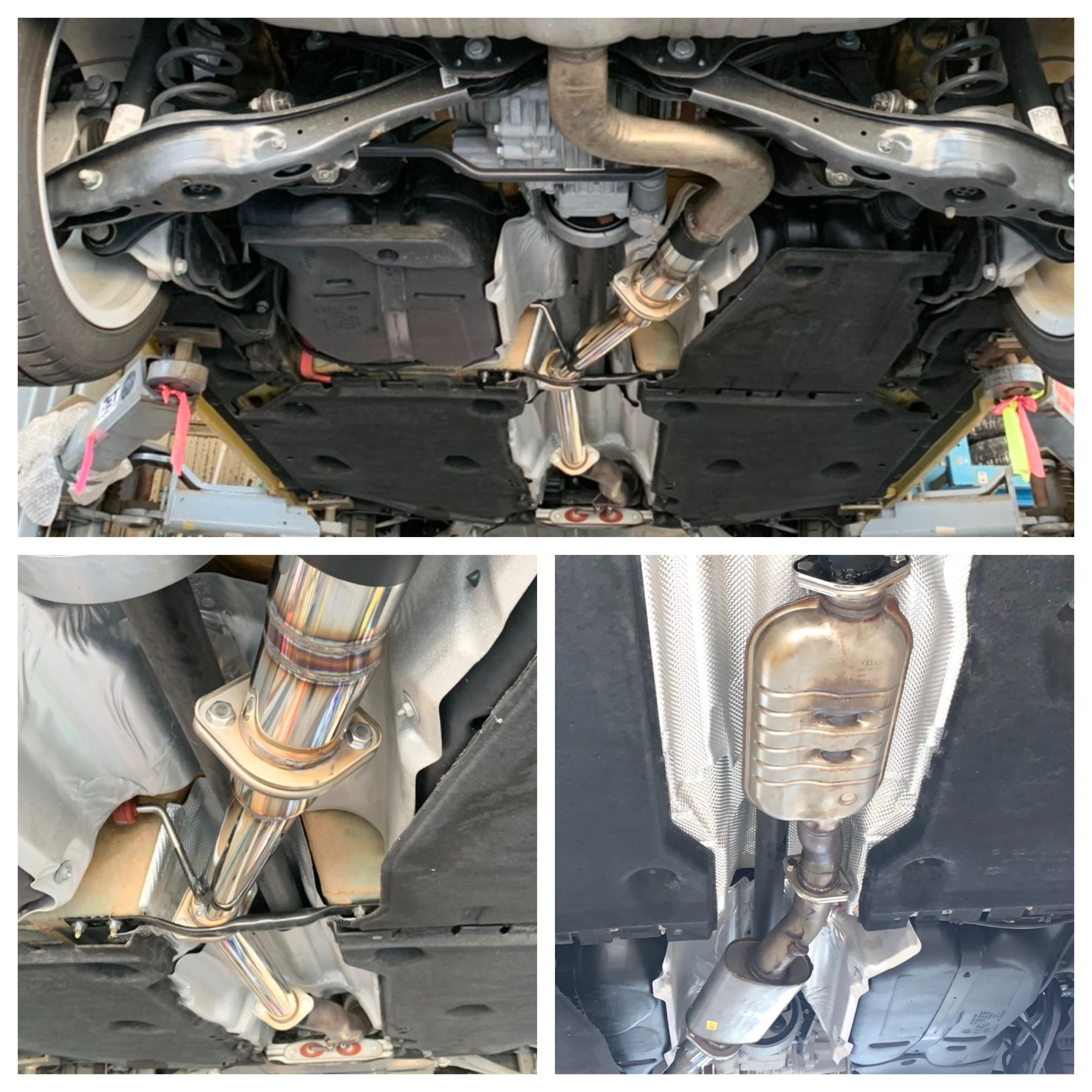 ↓ 画像上、左下が今回製作したストレートパイプ、右下が純正マフラーに戻した状態です。 純正に戻せるようにフランジを加工(溶接)し取り付け!(^O^)