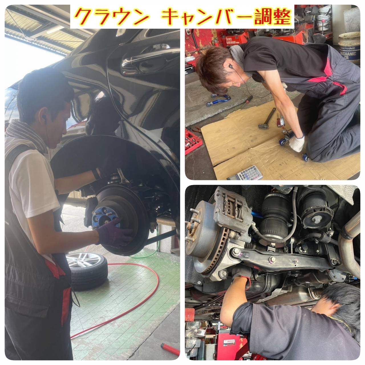 以前エアサスキットを取り付け、キャンバーアーム類を取り付けたE様のクラウンに、再度キャンバーの調整を実施。
