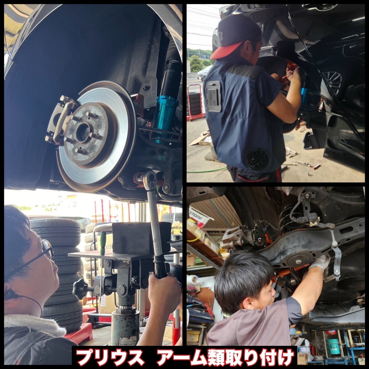 元々、車高調を取り付けていたこちらの車両【50プリウス】に、スキッドレーシングさんの【リアアッパーアーム】と【リアトーコントロールアーム】を取り付けて、リアのキャンバーをつけました!