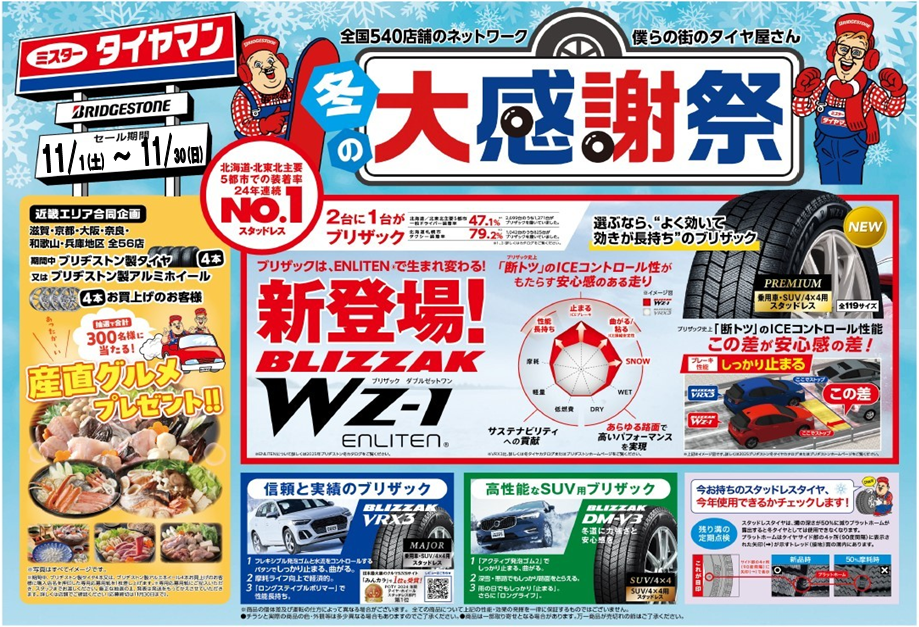 当店では11月29日まで「ミスタータイヤマン冬の大感謝祭」開催中です。