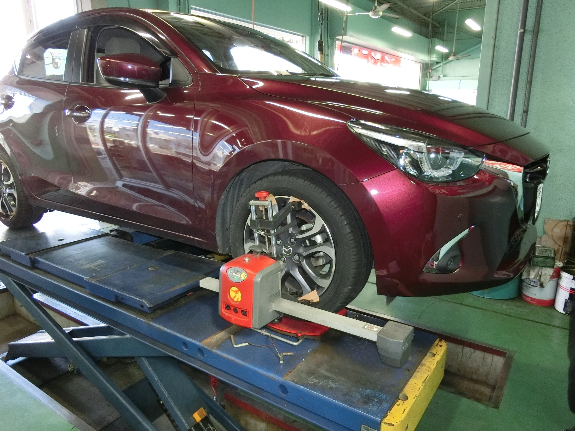 朝一からは、デミオさんアライメント調整しております。