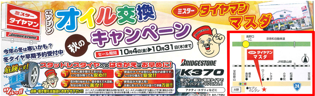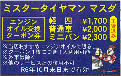 本日からミスタータイヤマンマスダでオイル交換キャンペーン開催いたします。