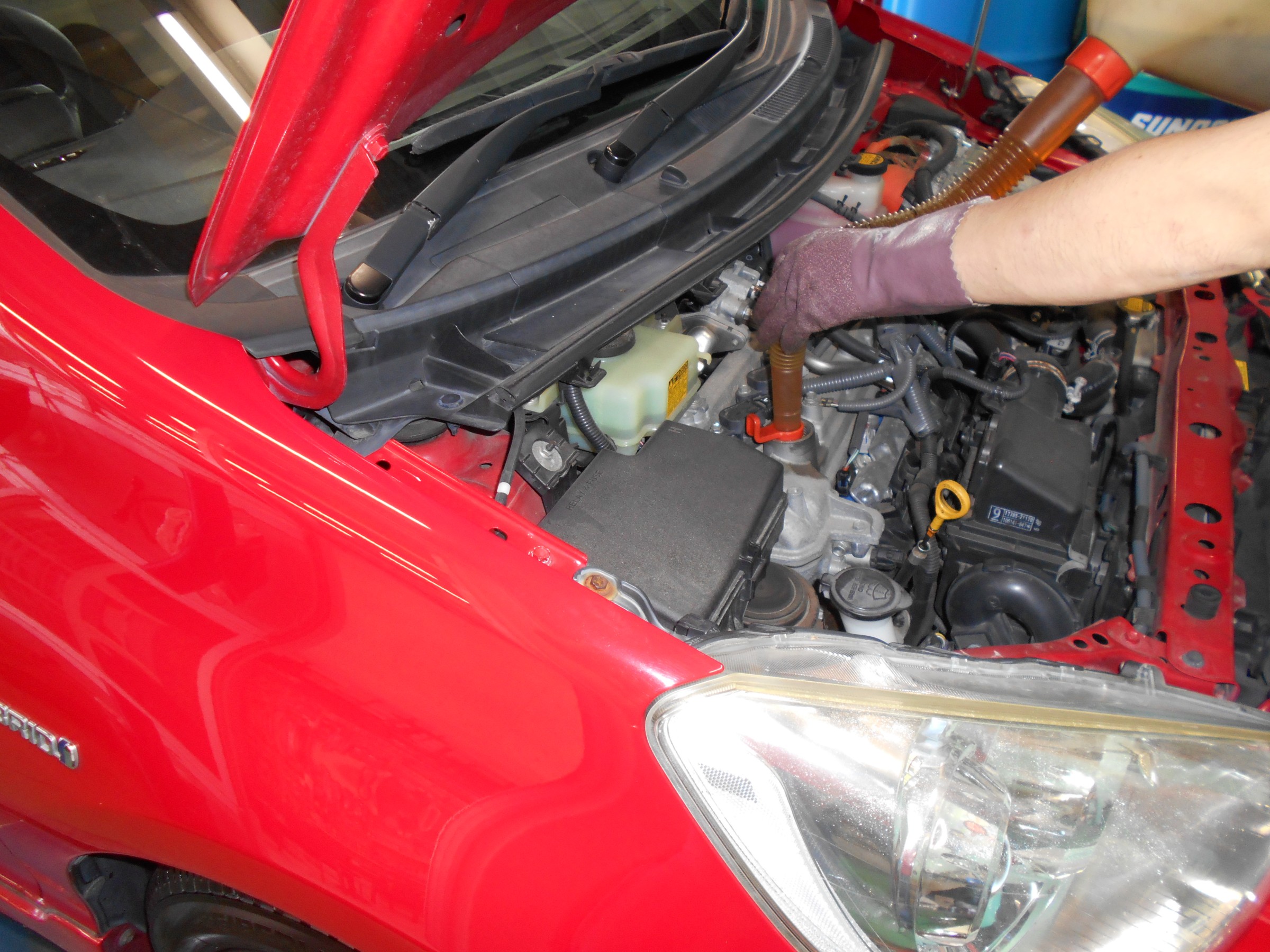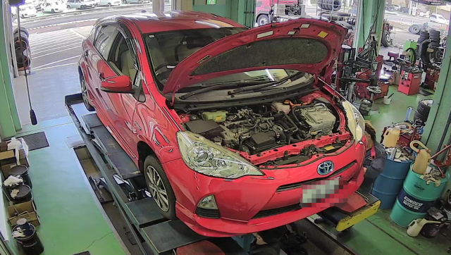 真っ赤なアクアさん。オイル交換でご来店。
