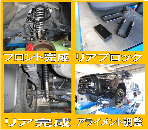 トヨタ ハイラックスさん。車高調交換に入庫しています。