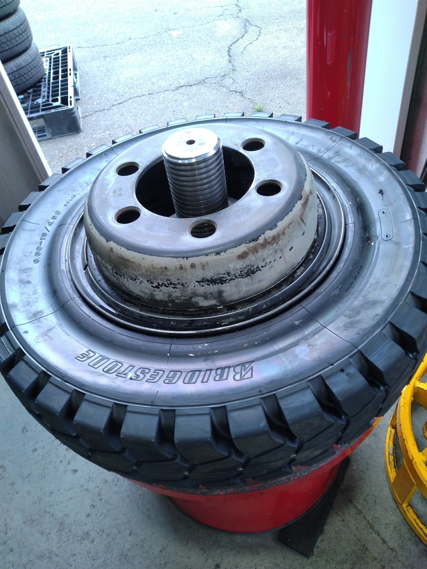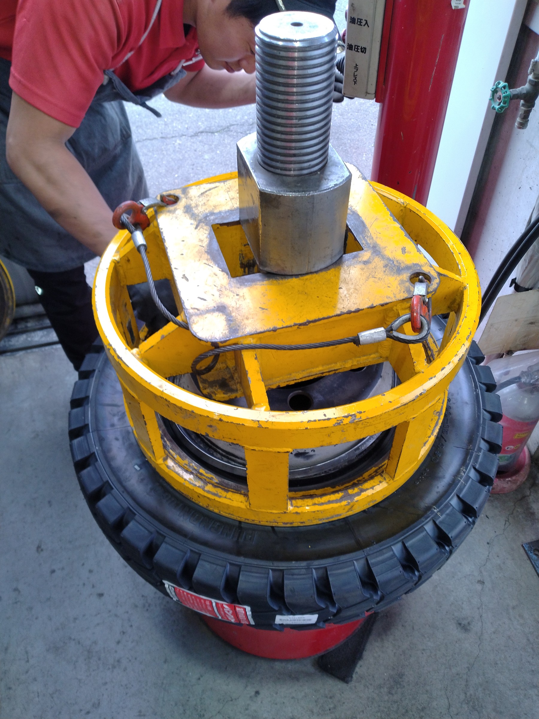 さて、今回は以前ご紹介したフォークリフトのタイヤの交換作業をご紹介します。 このタイヤ、パンクノンといいまして、すべてゴムでできているパンクしないタイヤなんです!