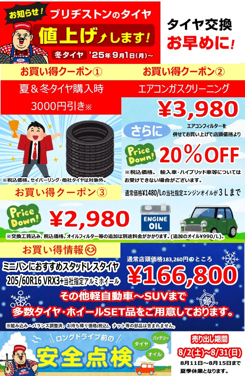 2025年9月よりスタッドレスタイヤが値上がりとなります。