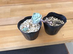 店内のあちこちに置いて育てている多肉植物です。 右側が親、左側が昨年の秋に葉押しした子供です。