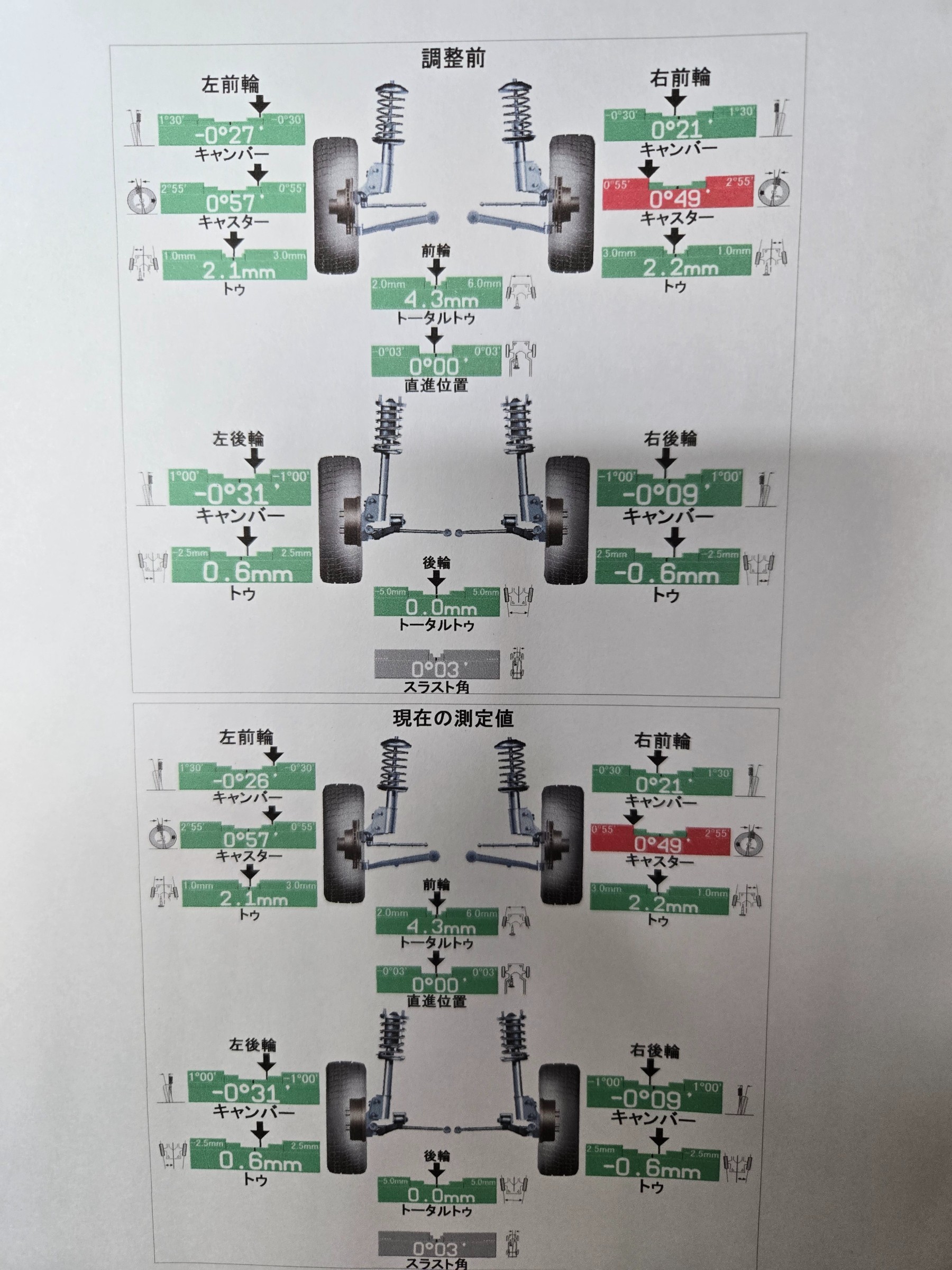 調整できるのが、フロントのトゥだけですが今回はタイヤの編摩耗等みられなかったので