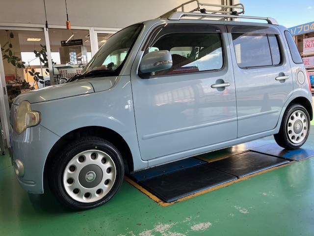 このミラ・ココア様。来店された時点で前後のタイヤの銘柄が異なっていました。