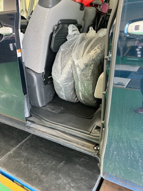 軽のスーパーハイトワゴンは、リヤシートの後ろのカーゴスペースは狭いので、殆どの方がリヤシートの足元にタイヤを積まれています。