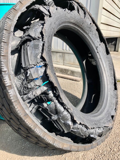 今回は空気が一気に抜けたので、バーストまでの時間が早かったですが、多くが①タイヤに異物が刺さる②ジワジワとエアが漏れる③知らずに走り続け、空気圧が半分以下に低下したタイヤが発熱&変形をし始める④尚も低下すると最後は耐えきれなくなってバースト となるのです。
