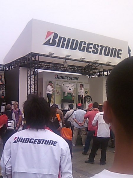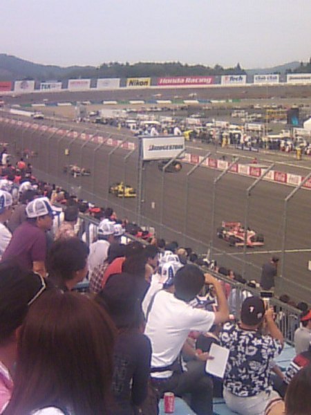 オープニングセレモニーは、流石アメリカ生まれのレースと納得の充実ぶりで、鼻血ギリギリのテンション↑↑↑世界のナベサダ(知ってるかなぁ;)と米軍基地所属のプロ・ロックバンドとのセッションや、ホンダS2000をオープンにしたナビシートにドライバーを立たせての紹介を兼ねたパレードなど延々と続き、アメリカ国歌斉唱直後にブルーインパルスが真っ青な空に突如飛来!!
