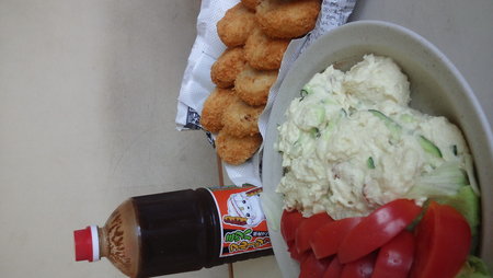 頂き物のじゃがいも(F田様より)と、頂き物のきゅうり(F田様より)、頂き物の玉葱(あっ君より)、頂き物のトマト(T井様より)で、コロッケとポテトサラダの昼ご飯です♪