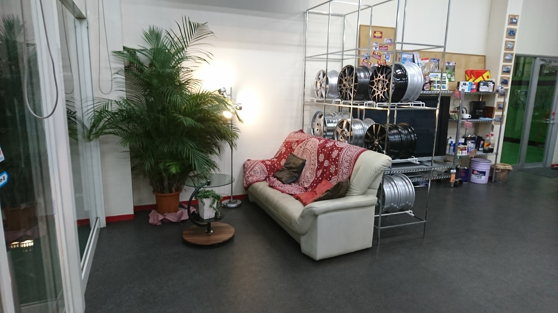 今までホイールの陳列棚があったところへソファーを移動しテラスみたいな居心地のいい空間を作りました
