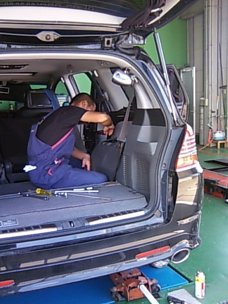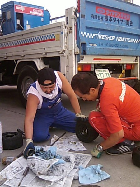 電動立ち乗りフォークリフトの特殊なタイヤ入替作業(何しろ勤続24年の工場長を「今までやった事無いタイヤは無いと思ってたけどなぁ」とうならせたんだから、余程の構造だったに違いない!!)の横では、オデッセイ(これがまたイイ感じに仕上がって、お客様も大満足でした♪)の車高調取付。不安定な気候の中でバテ気味なはずなのに、やる事には寸分のスキも無く・・・・流石プロ!!