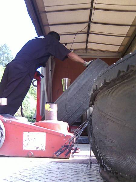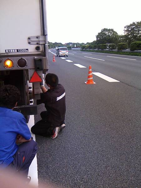 東北道上り車線にてレスキュー。後輪の泥よけを巻き込んでの、派手なバーストでお困りでした。